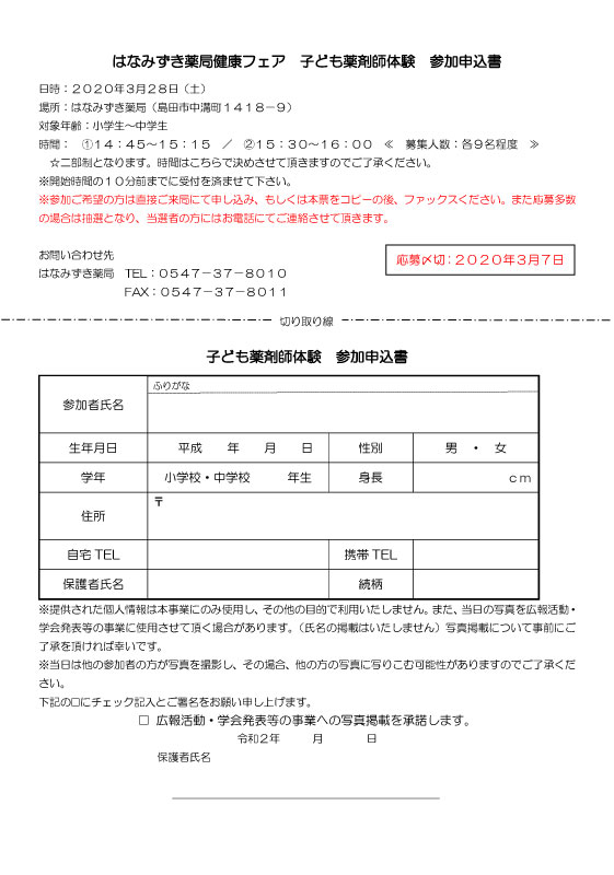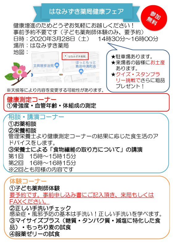 3月28日開催予定のはなみずき薬局健康フェアは中止致します