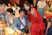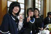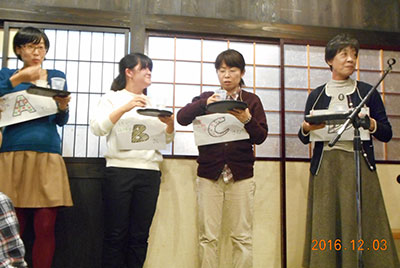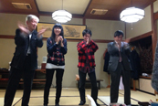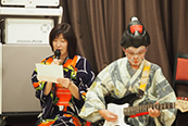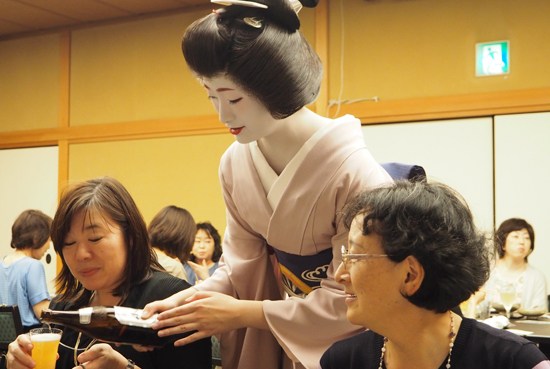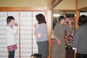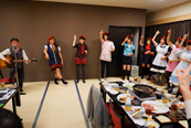 今年の社員旅行の祇園畑中での「京料理と舞妓の夕べ」から閃きを得たパフォーマンスでした。社長のギター(三味線の音をだしていた!!)とMさんの大人っぽい唄と共に、3人の舞妓さんが優雅な!?舞を舞いました。
