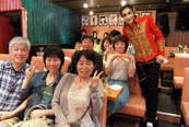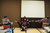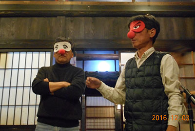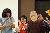 | 7. | 締めの言葉『歌舞伎調 海老蔵風』部長・Wさん 最後に飛び出してきたのは、歌舞伎の隈取をほどこした二人。見事な歌舞伎口調で、最後の締めの言葉を述べ、はなみずき薬局のますますの繁栄を全員で誓いました。 |